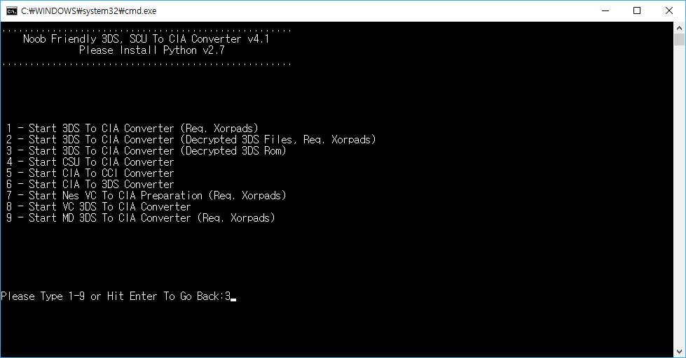 3DS To CIA Converter를 실행하고 3을 누르고,